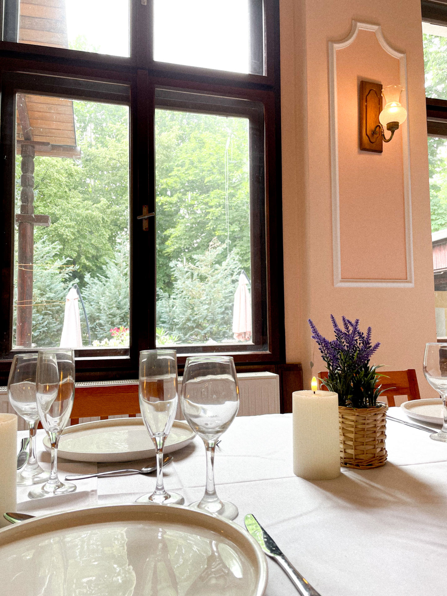 Experience the elegance of fine dining with beautifully set tables, floral centerpieces, and vintage decor. Enjoy the ambiance of our dining hall with large windows and a view of lush greenery outside.